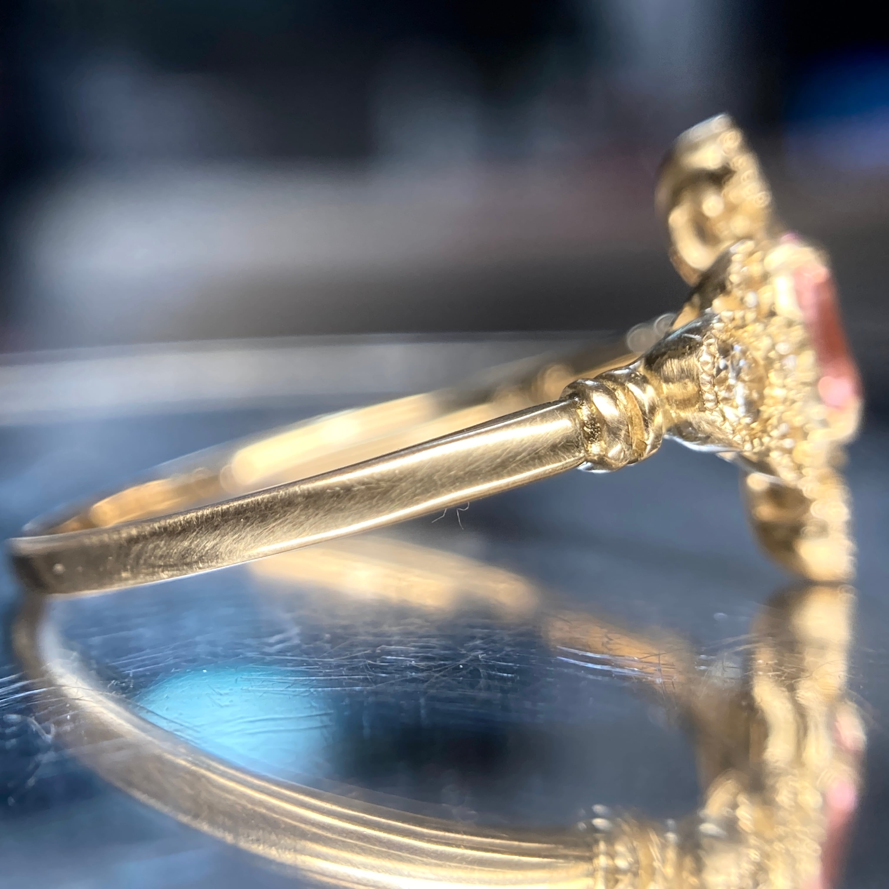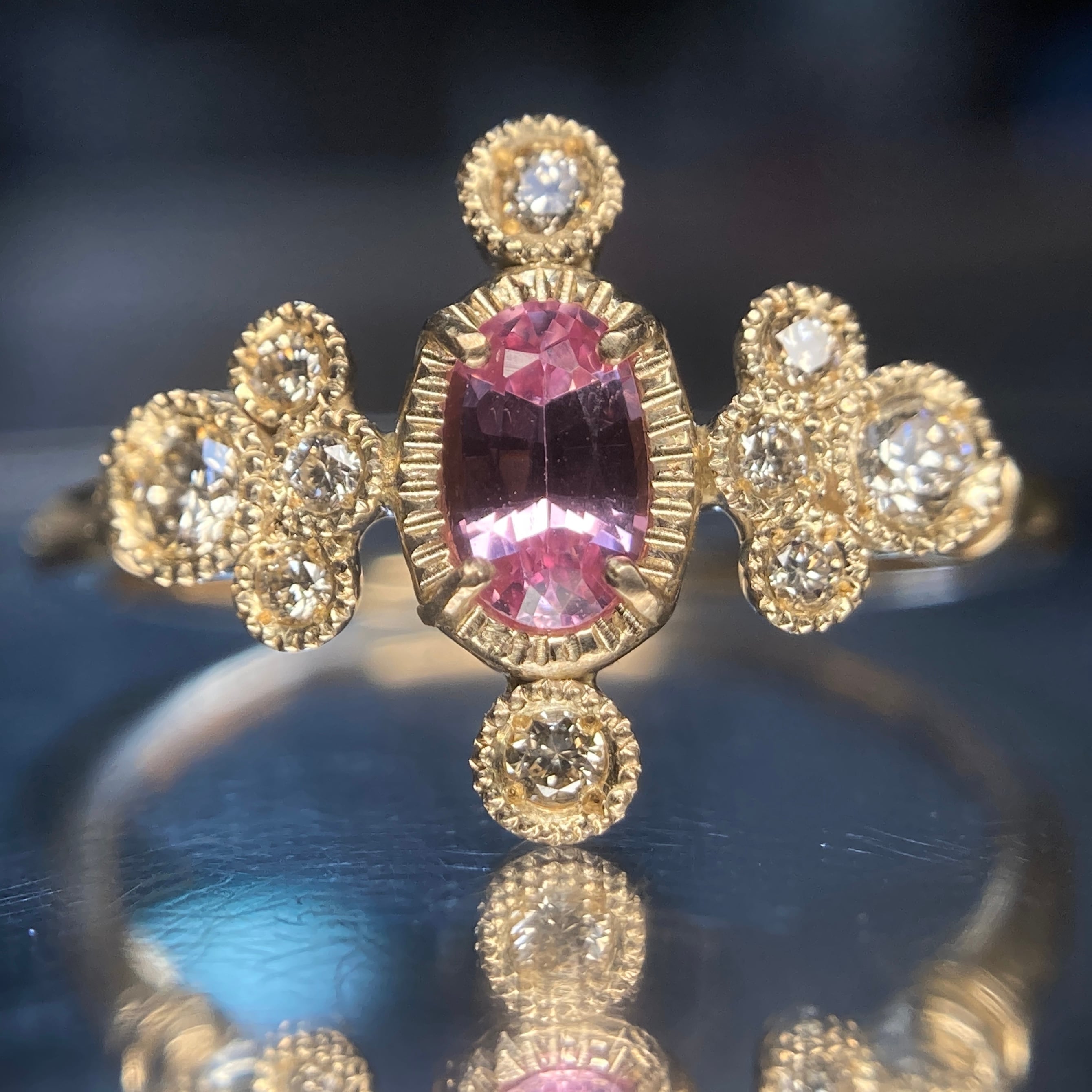 ショルダーには大小のダイヤモンドを肉球みたく配置し、上下にもバランスよくダイヤを装飾してクラシカルかつジュエリー感あるリングに仕上げました。