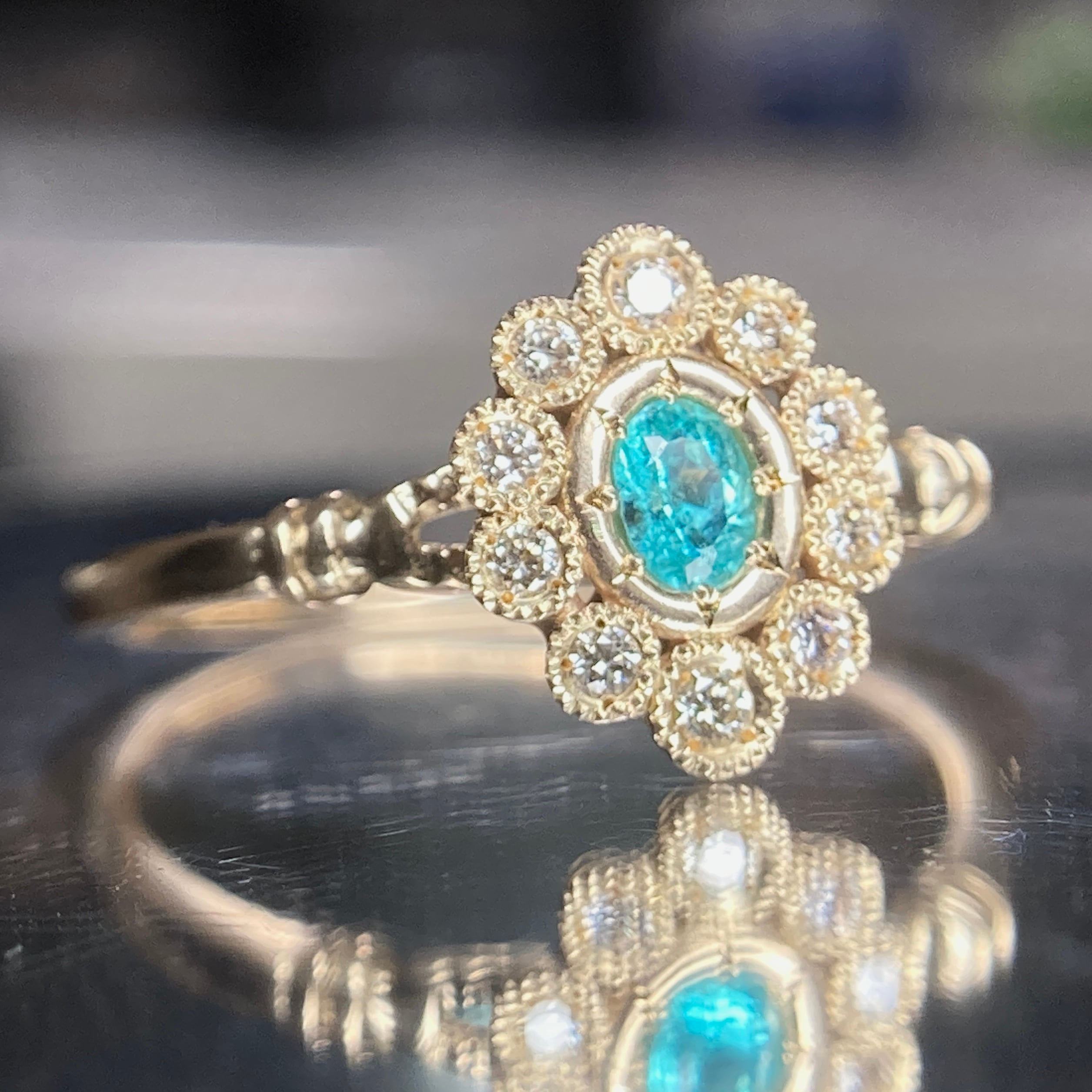 大小のダイヤモンドを組み合わせて仕上げたフルクラスターデザインは、センターのパライバトルマリンに合わせて石枠ひとつひとつをバランスよく組み上げているのでリングとの一体感、指なじみにの良さがポイント。