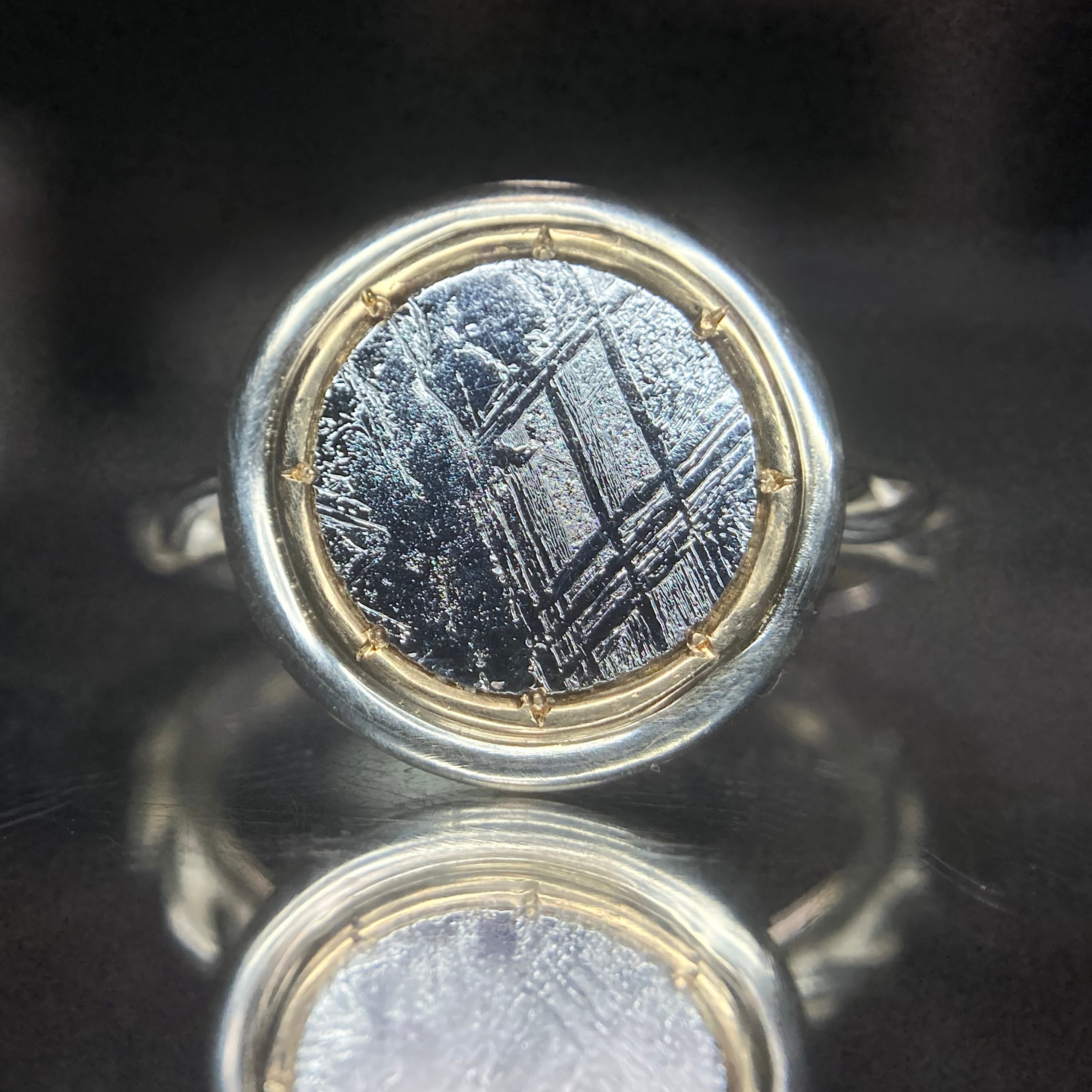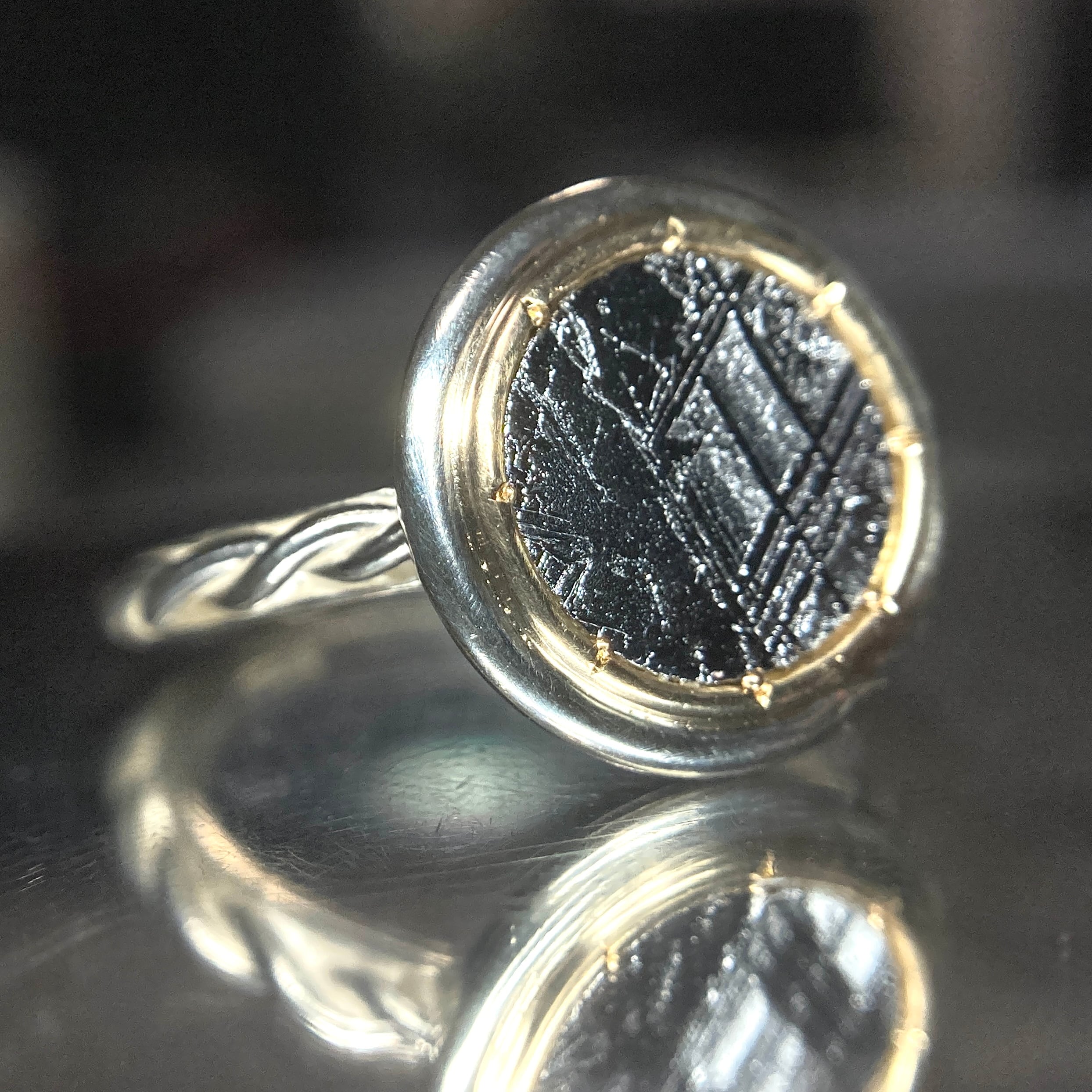 たっぷりのロマンと魅惑的な模様を楽しめる、ムオニオナルスタ隕石コインカットをクールなリングに仕上げました。