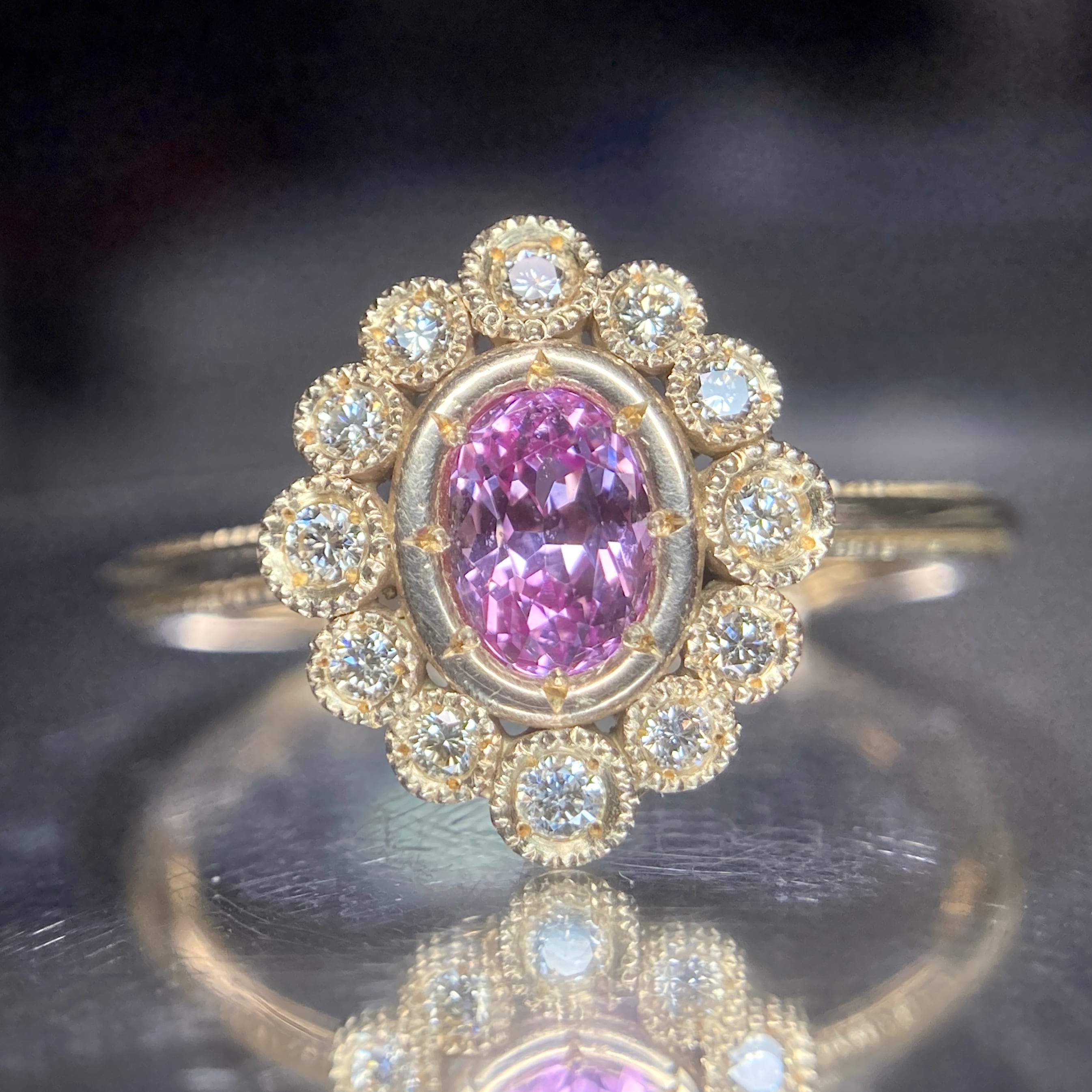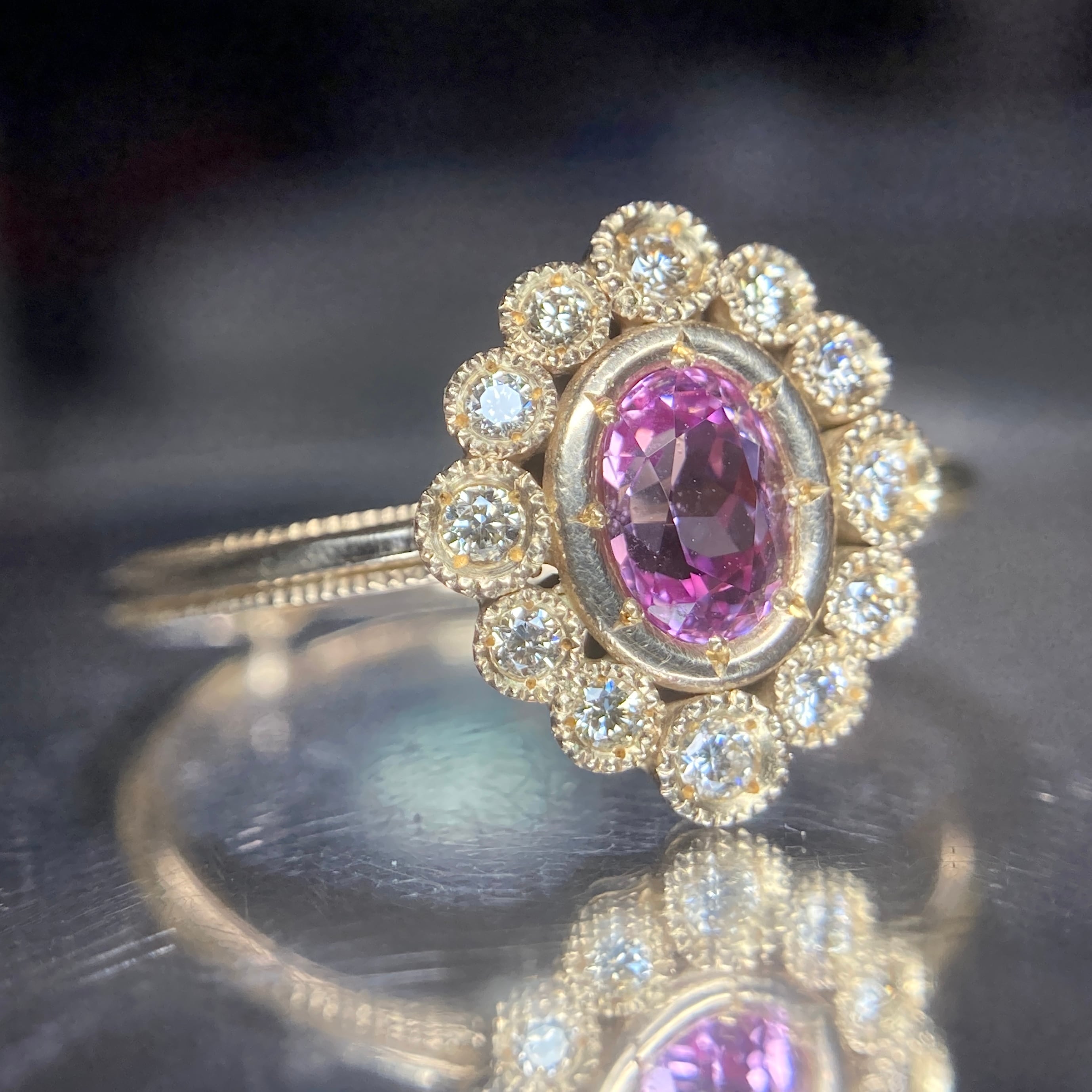 縦長シルエットのオーバルカットに合わせ、一つずつ組み上げたダイヤモンドフルクラスターが華やかに彩ります。