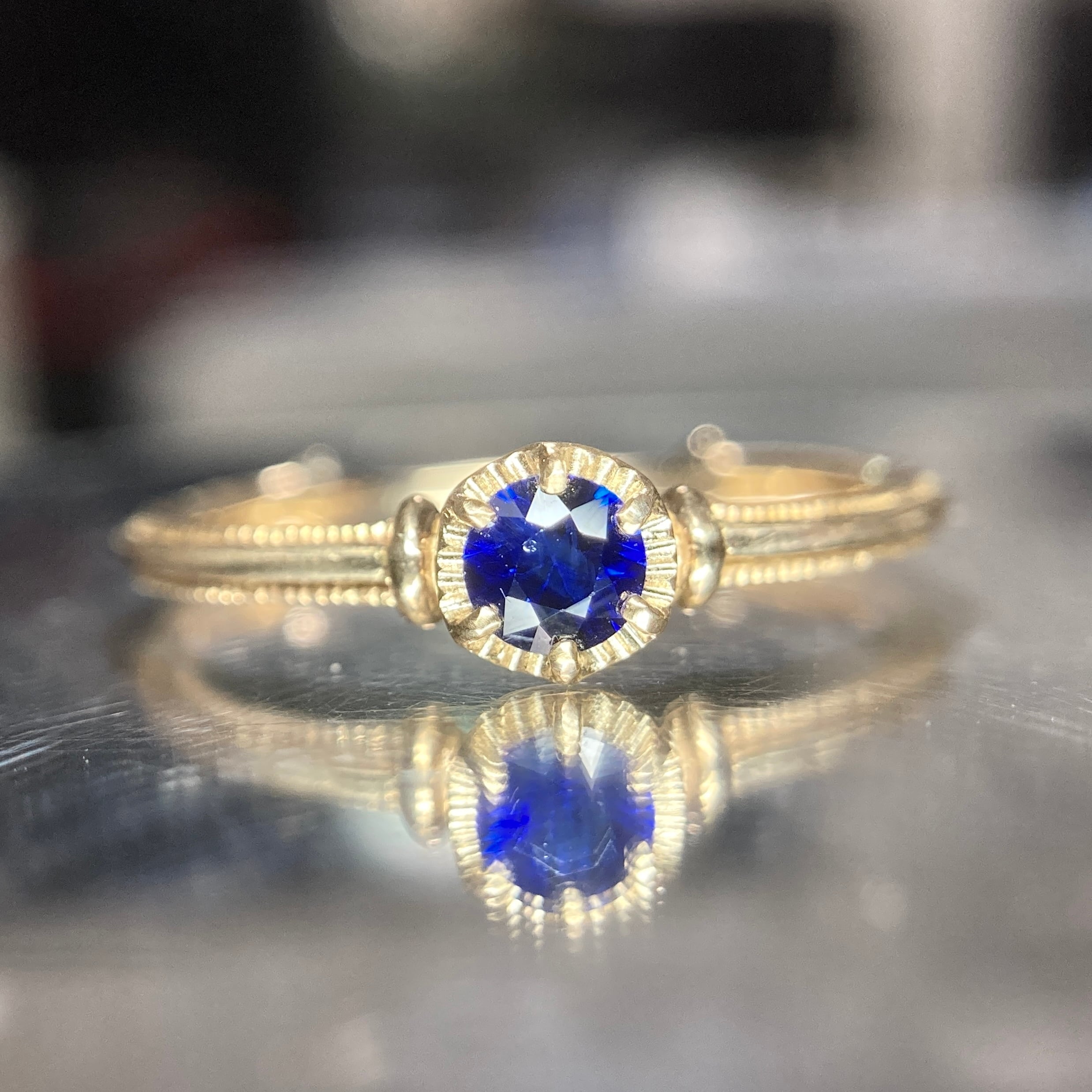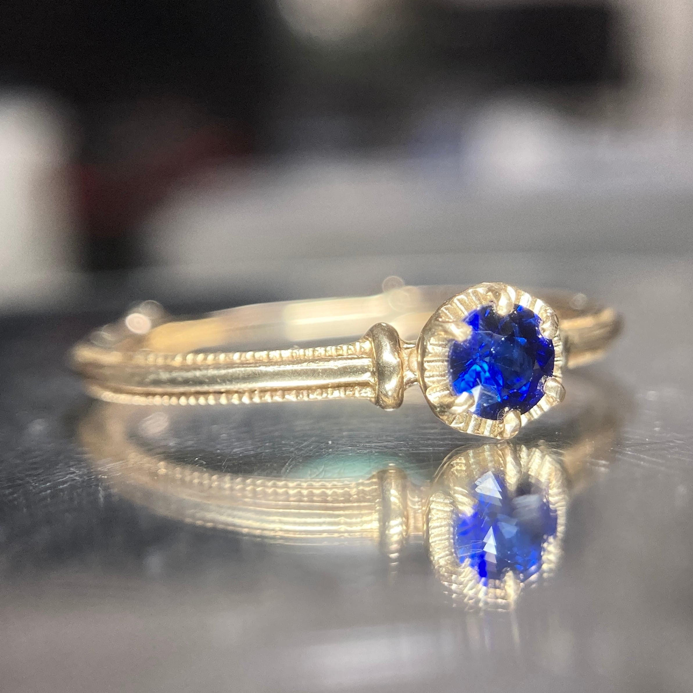 クラシカルなディテールを配したアームに合わせ、アンティーク感とサファイアの上質感を楽しめるリングに仕上げました。