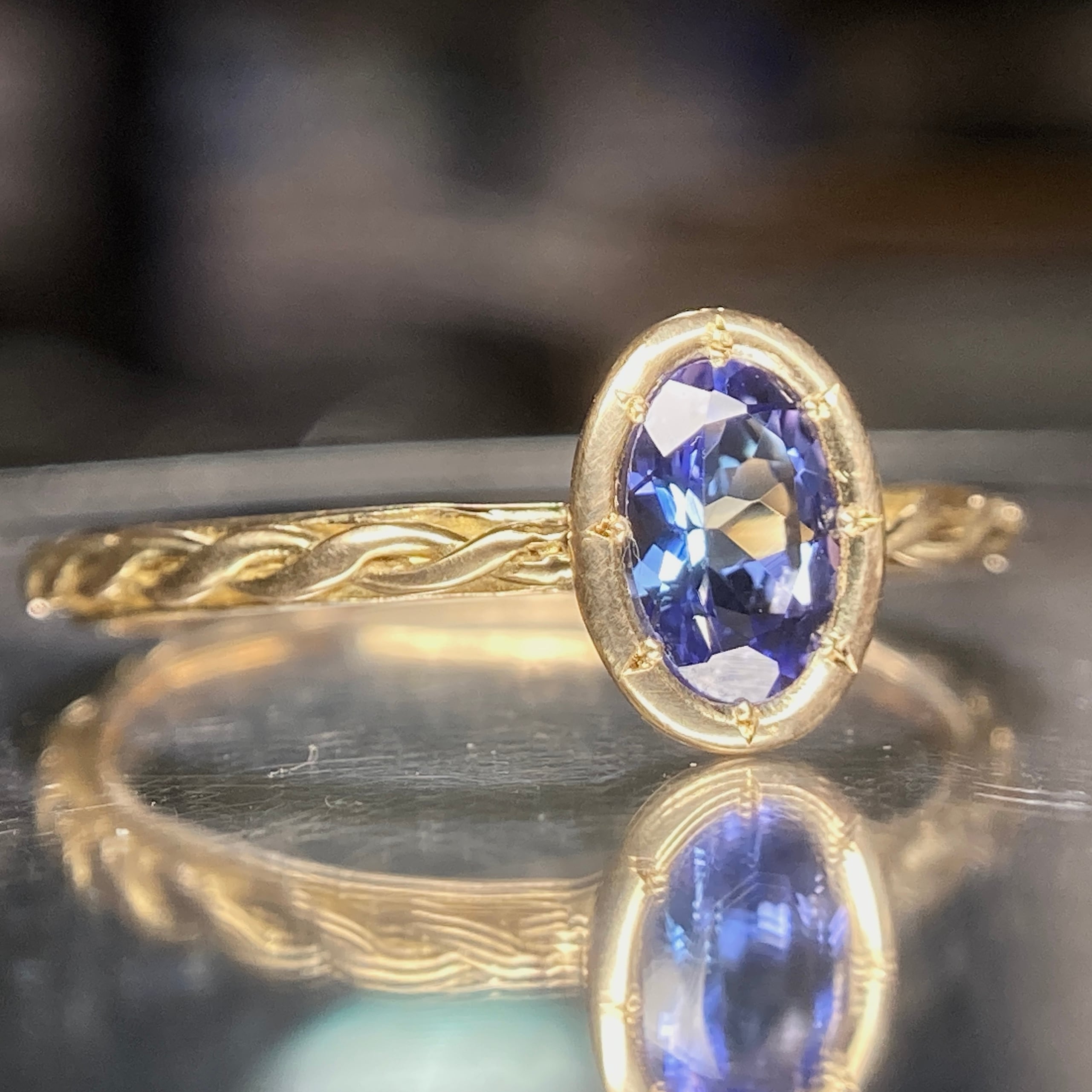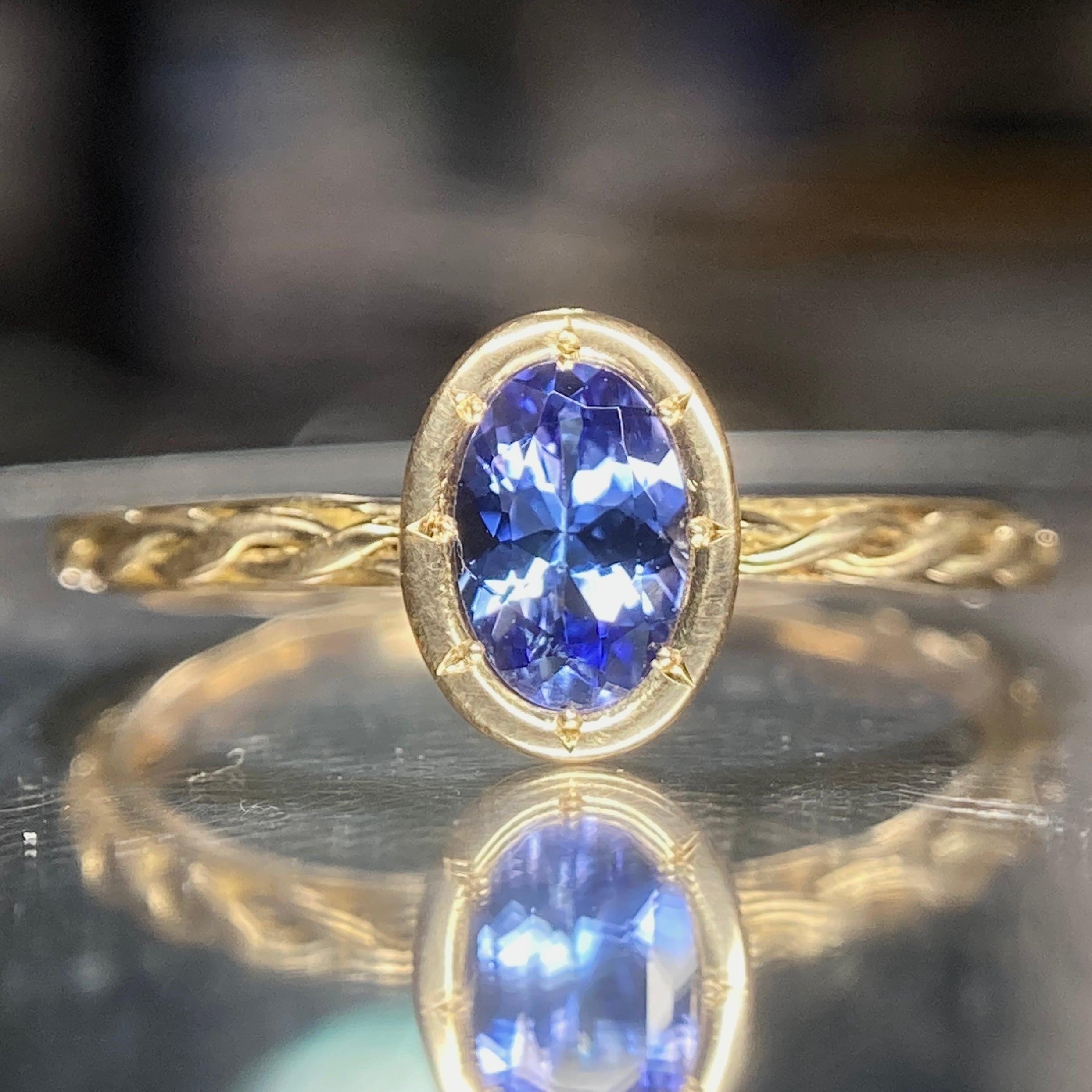 ほどよくライトなラベンダーブルーの発色が華やかさと軽やかさを感じさせるタンザナイト。少し縦長プロポーションのオーバルカットはパビリオン部分を厚く細かくカットされ、奥行き感のある輝きをしっかりと引き出しています。