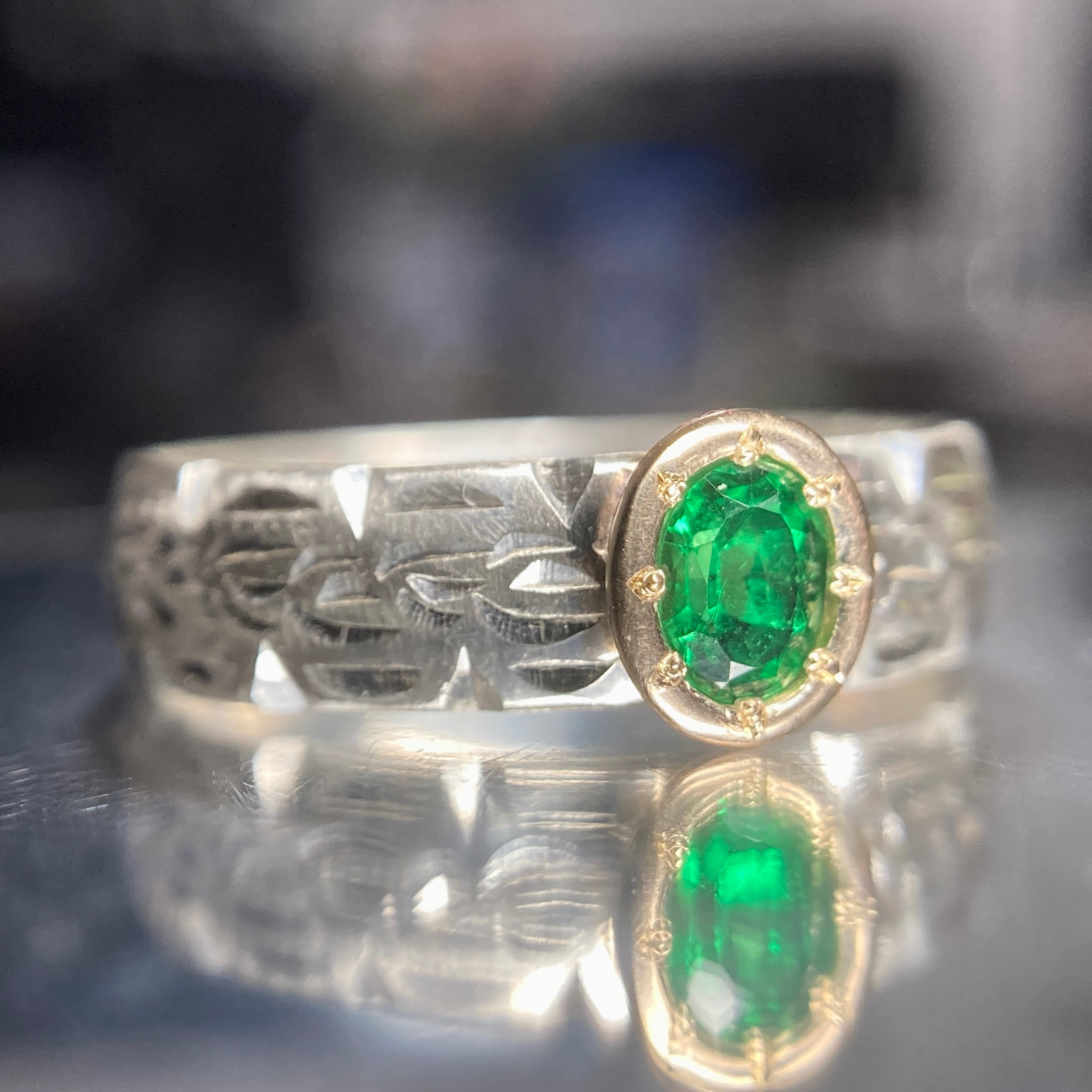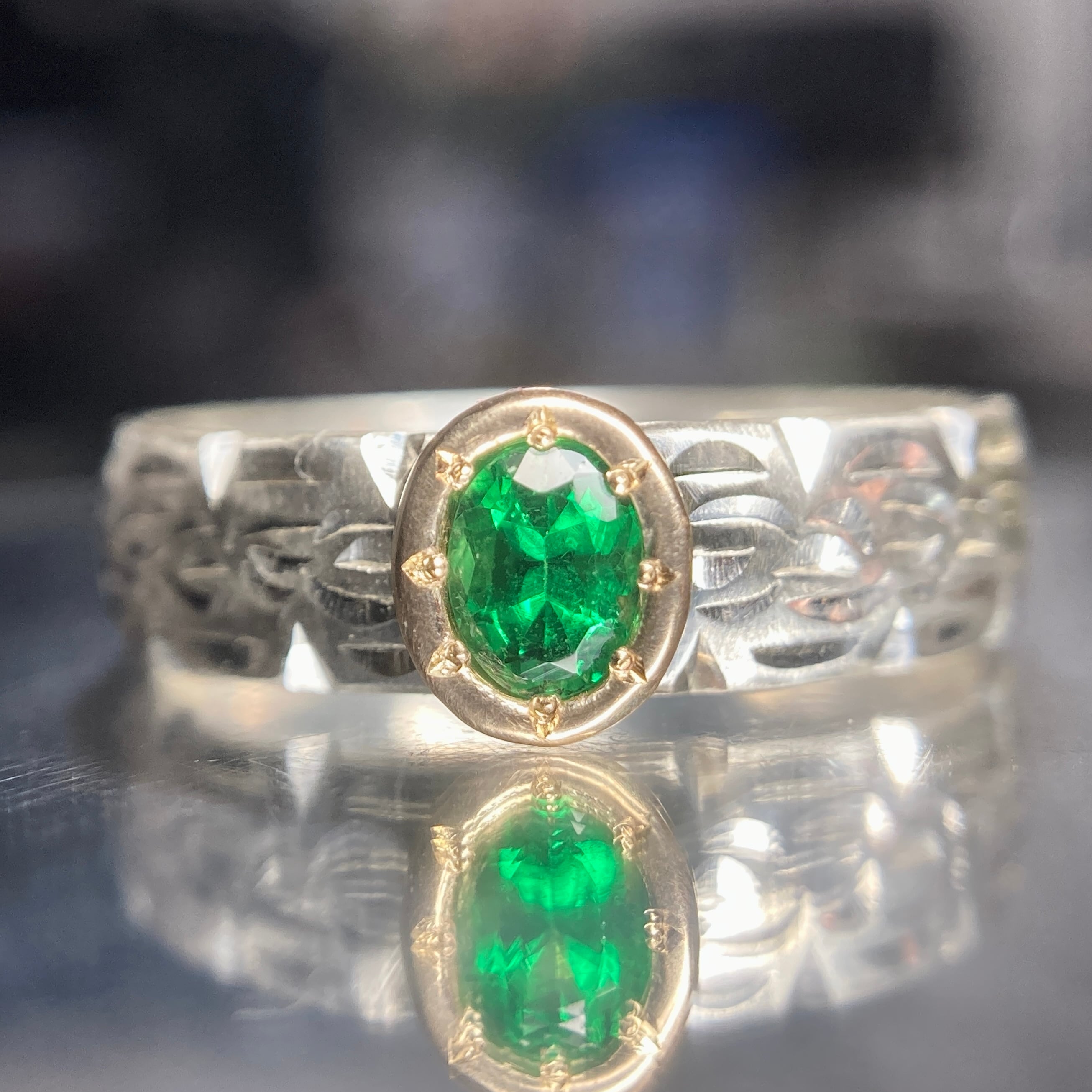 センターストーンのグリーンガーネットは濃いめの発色ながらも華があり、クラス感も上々。