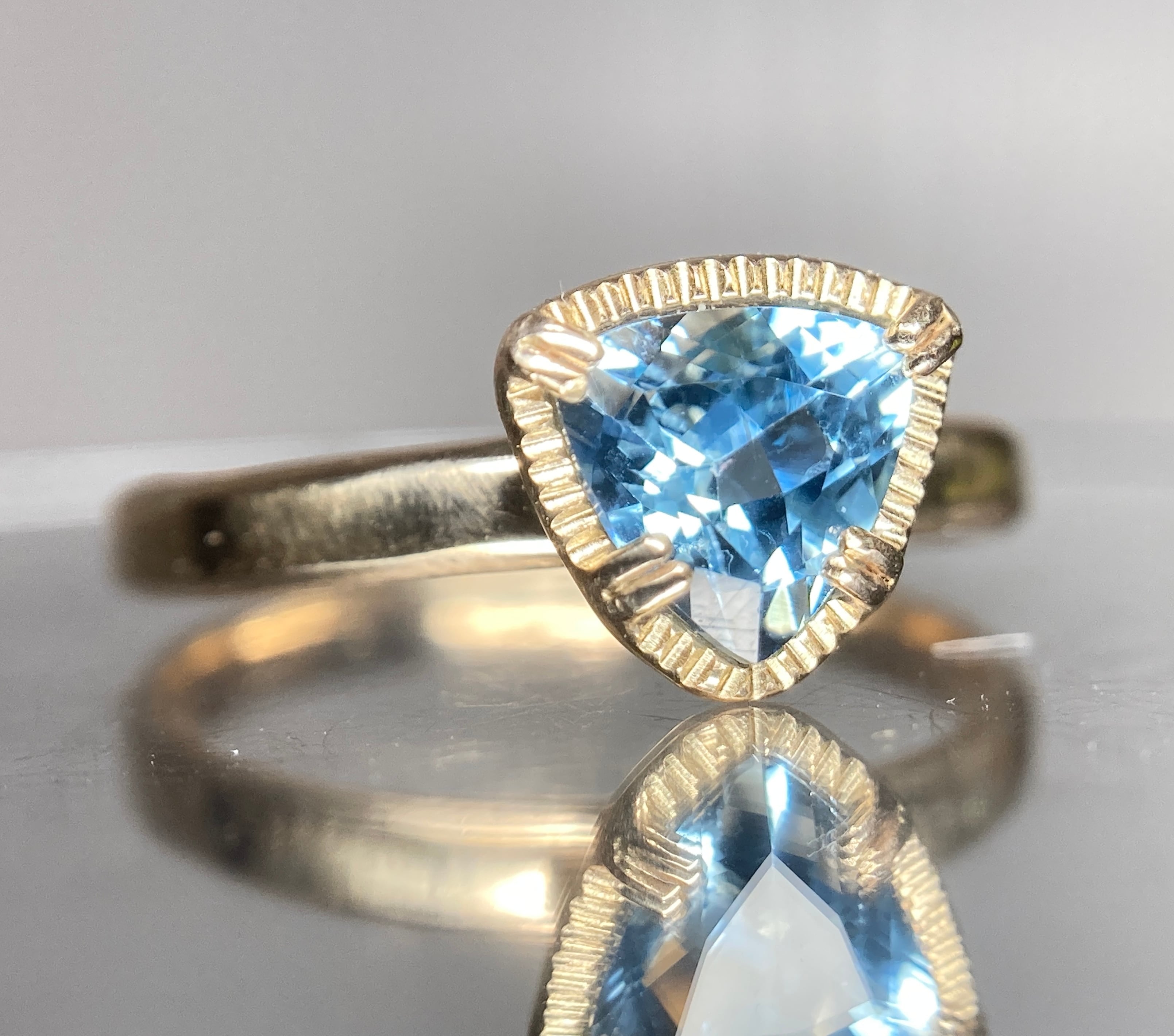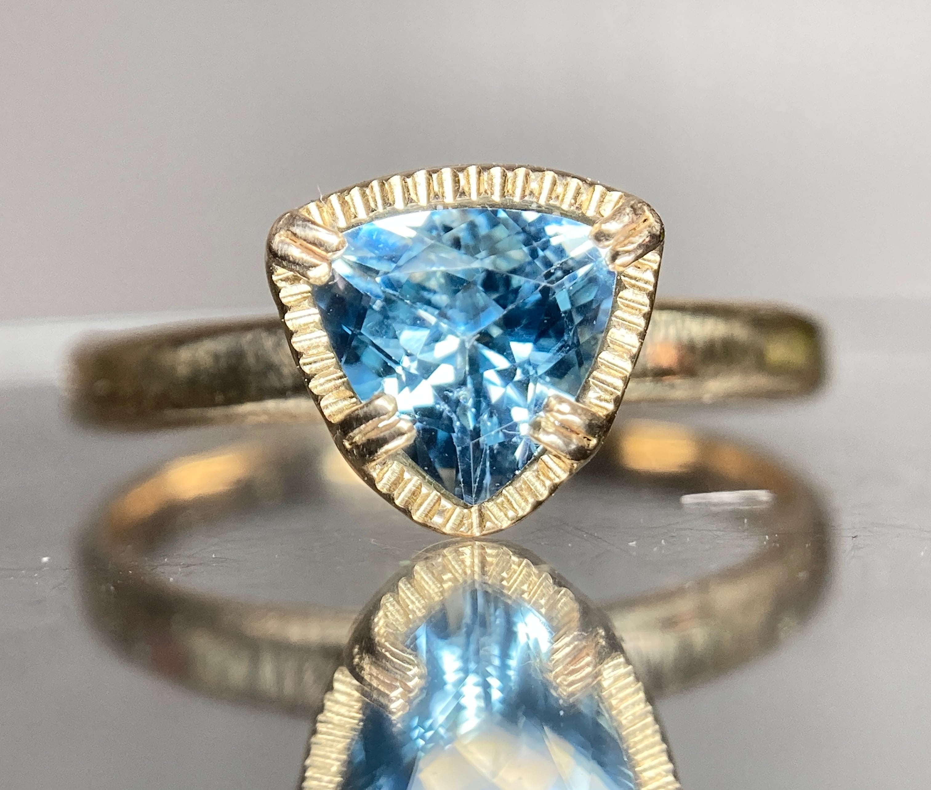 しっかりとアクアブルーが堪能でき、トリリアントカットが引き出す輝きはクラス感たっぷり。