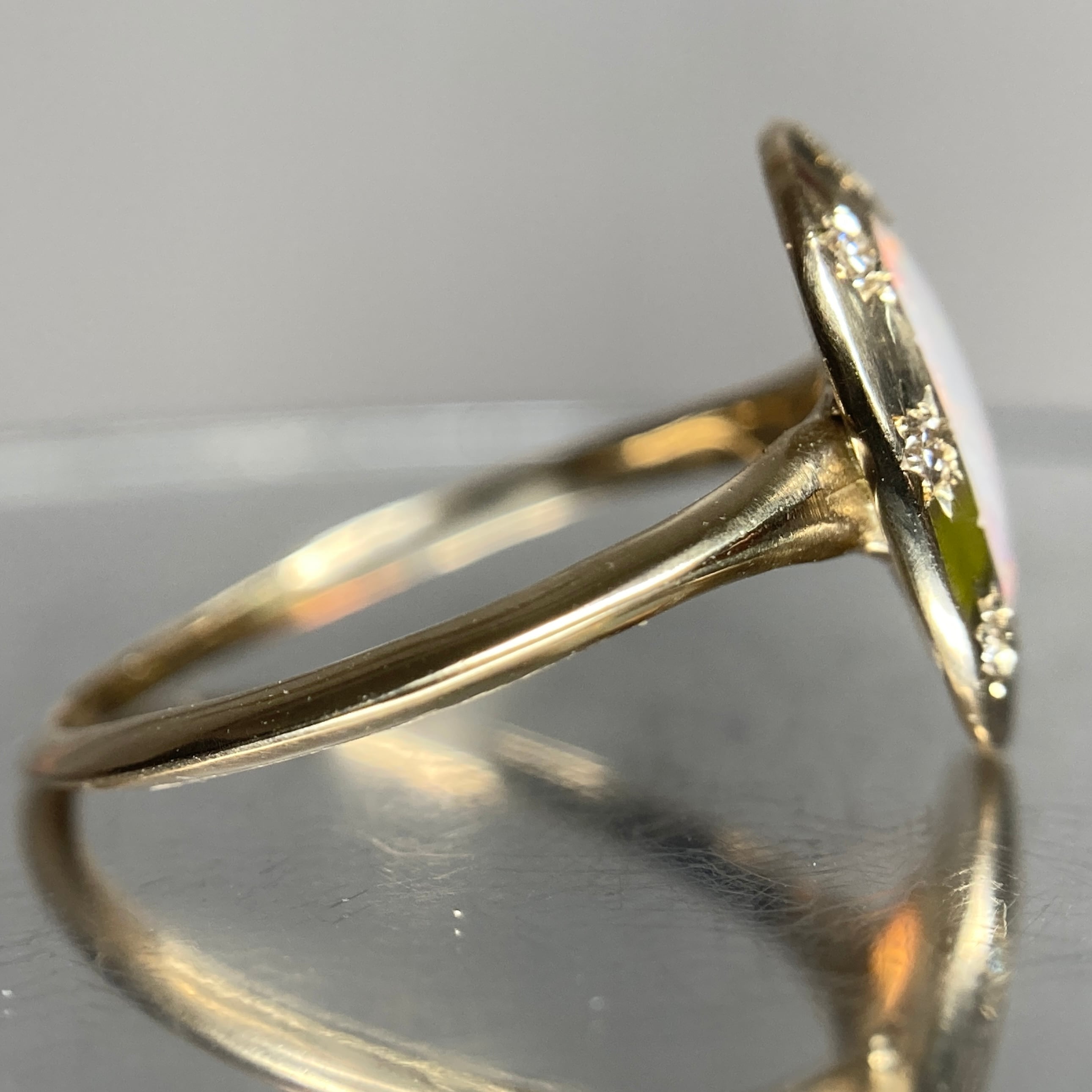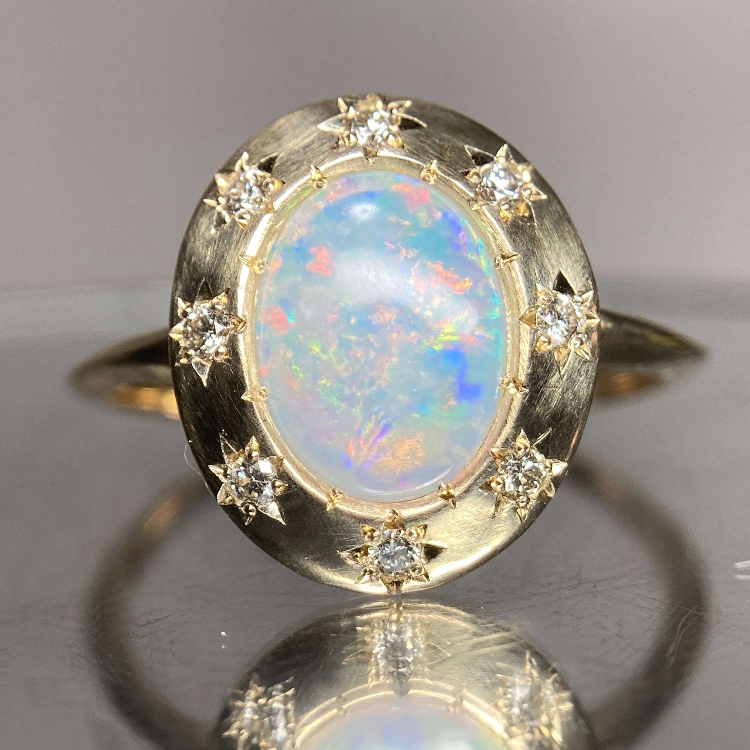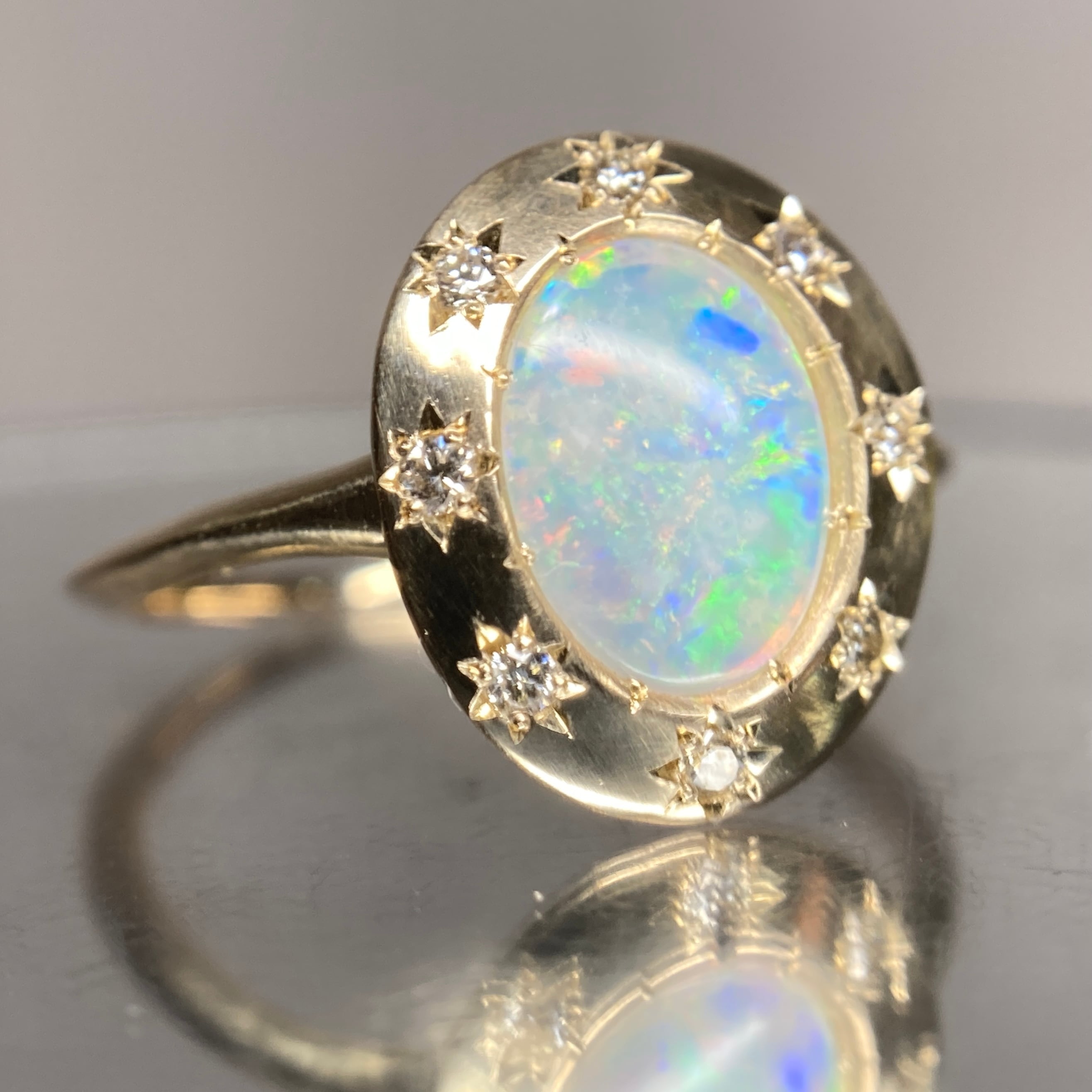 バランスよく様々な色合いの遊色が楽しめるオーストラリア産オパールをセンターに、プレートスタイル×ダイヤモンド星留めのスタークラスターデザインで仕上げました。