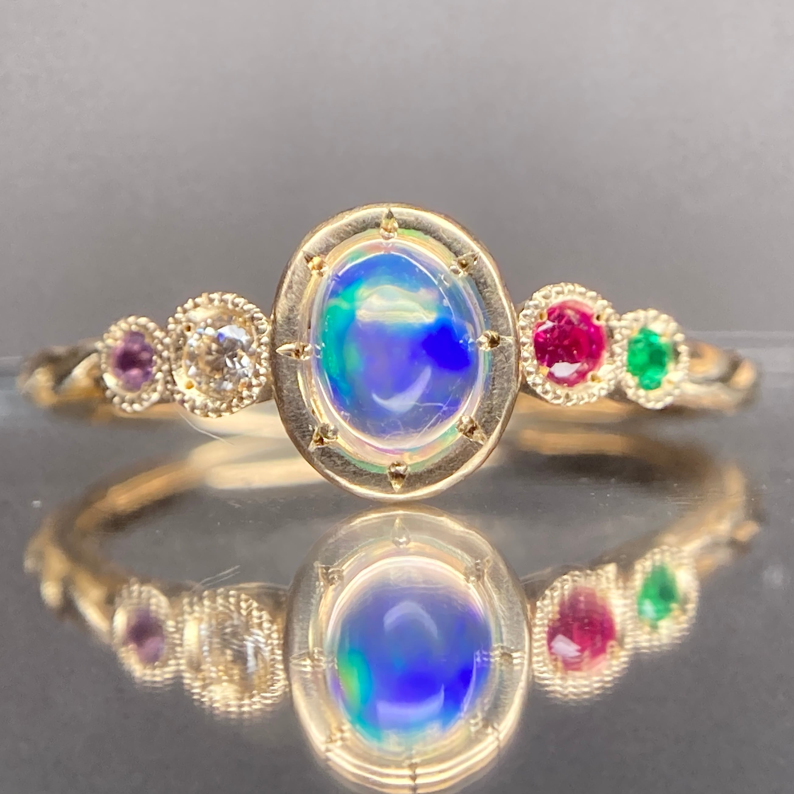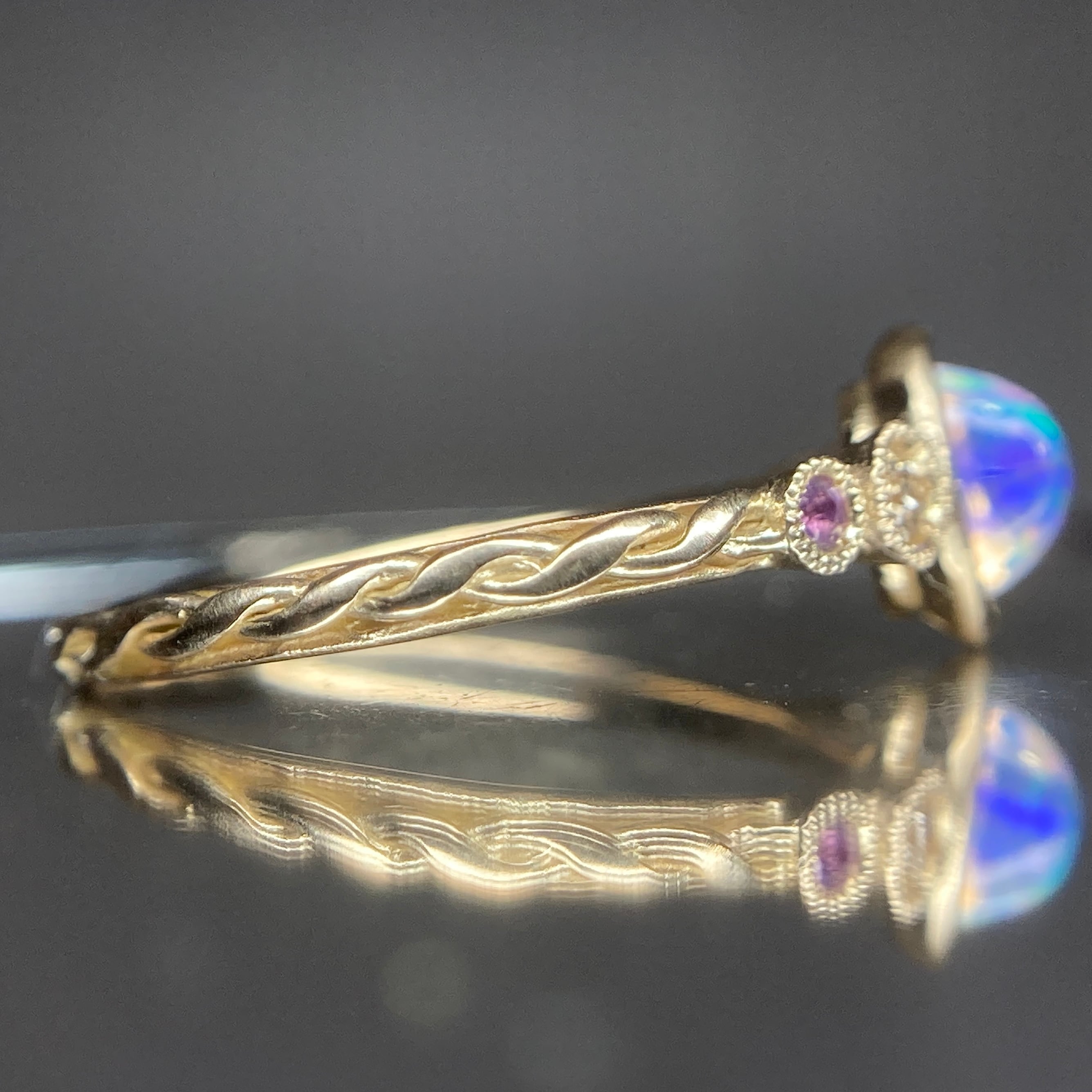 上品かつ幻想的に浮かぶ遊色とそれを彩るサイドストーンの色合いと輝きが楽しめる、ロマンある1本です。