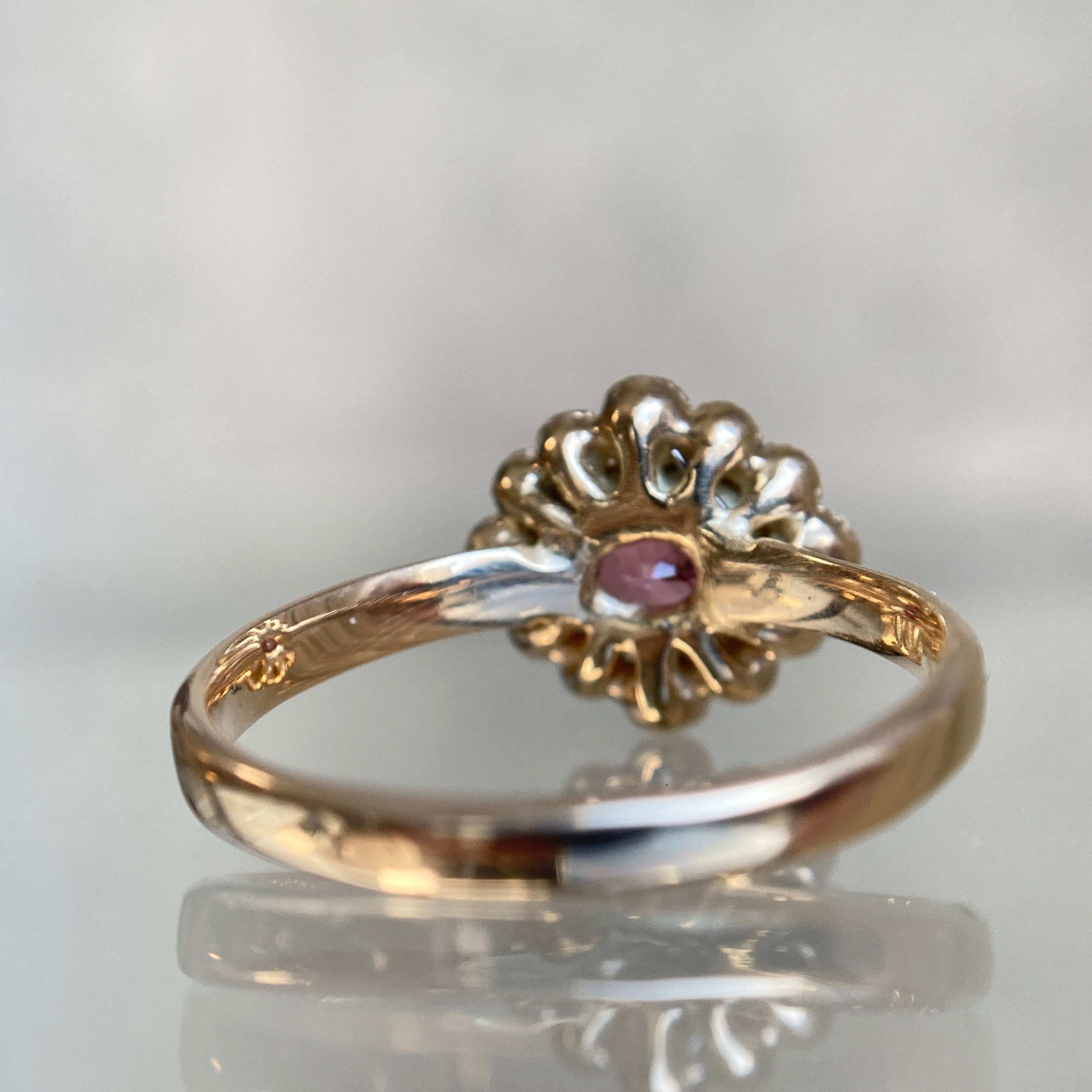 スピネルの周囲をミルグレインセッティングしたダイヤモンドで取り巻き、色のメリハリと華やかさ、クラス感を高めた一本に仕上げました。
