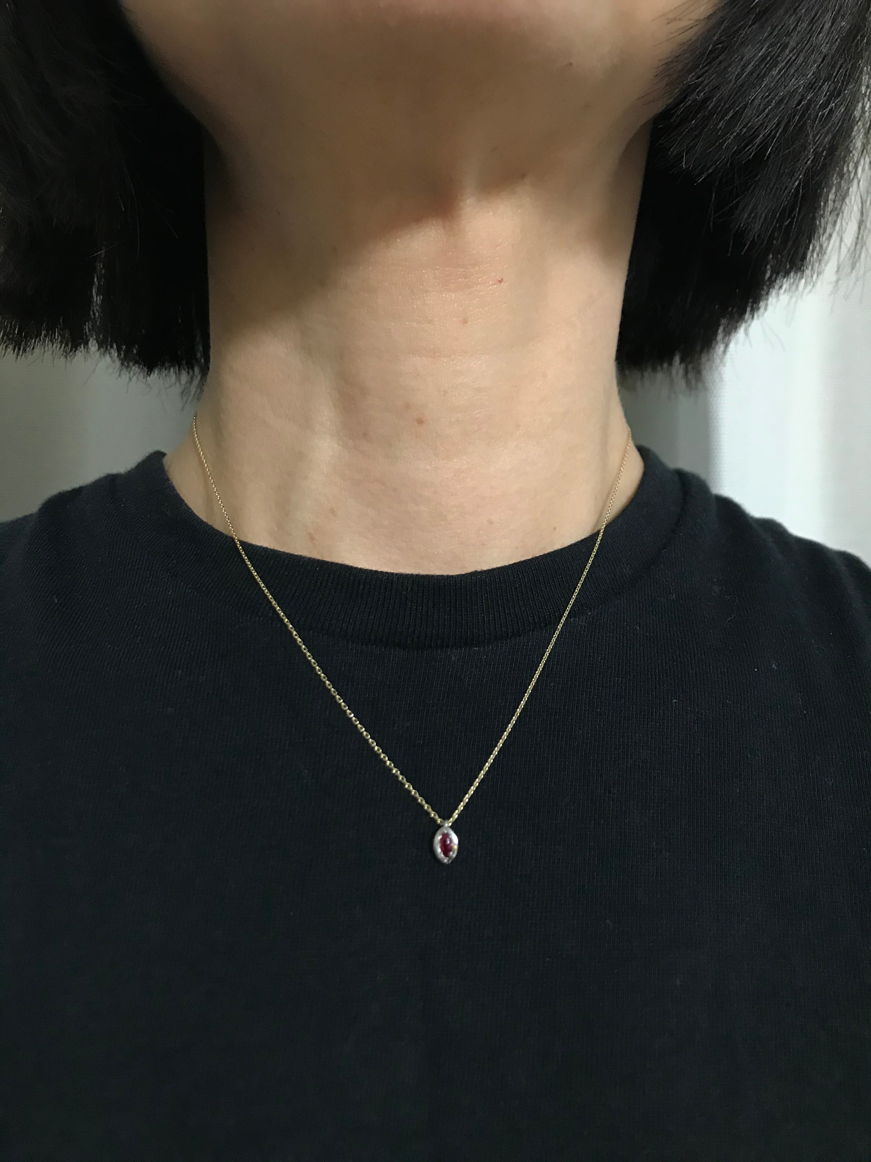 ペアシェイプのカットは小ぶりサイズながらも抜け感無く、キリリとした輝きを放ちます。